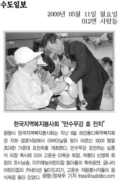 2009어버이날 기념 "만수무강 효잔치" 성료 페이지 정보 작성자 최고관리자 댓글 0건 조회 6,216회 작성일 09-05-11 00:00 본문 2009어버이날 기념 "만수무강 효잔치" 성료 목록 이전글2009 어버이날 기념" 제9회 어버이 효사랑 푸드뱅크 나눔마당" 09.05.11 다음글2009 행복+사랑÷ 바자회 성료 09.04.27