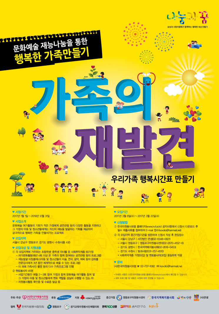 [나눔과꿈] "가족의 재발견" 프로그램 안내 페이지 정보 작성자 한국지역복지봉사회 댓글 0건 조회 15,340회 작성일 17-03-20 00:00 본문 문화예술 재능나눔을 통한 행복한 가족만들기 “가족의 재발견” 목록 이전글나누미 어울마당에 초대합니다 17.03.20 다음글[나눔과꿈] "가족의 재발견" 멘토봉사단 모집 17.03.20
