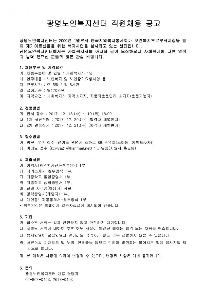 광명노인복지센터 직원채용 공고 페이지 정보 작성자 한국지역복지봉사회 댓글 0건 조회 14,599회 작성일 17-12-13 00:00 본문 광명노인복지센터 직원채용 공고 목록 이전글한국지역복지봉사회 2017년도 결산공고 18.03.12 다음글2017년 청소년 자원봉사 현장체험 신청안내 17.07.17